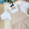 Conjunto composto por: Camisa social na cor Branca, Jardineira na cor bege e gravata borboleta Bege