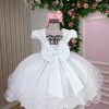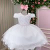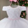 Confeccionado em tecido misto possui forro em poliéster e algodão para não incomodar a criança e proporcionando um caimento incrível e sofisticado, possui gola redonda, comprimento médio, mangas curtas, contém, também, elástico nas costas para melhor ajuste, acabamento com lindo laço na parte posterior do vestido completa o look dos sonhos!